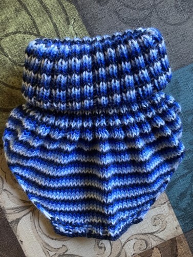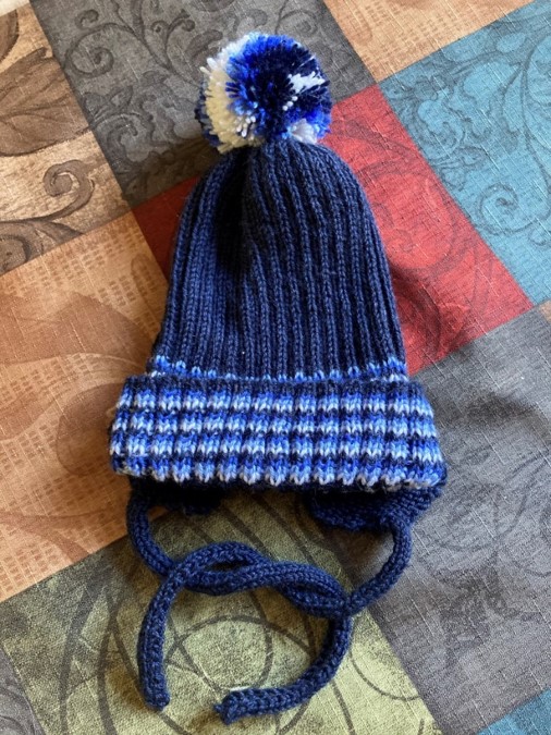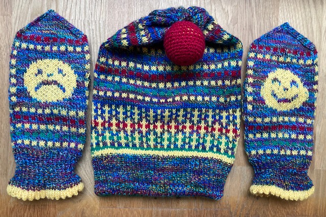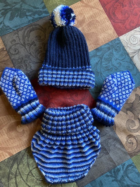 A set of baby-boy winter accessories – knitted from three colors of merino wool. 2020.