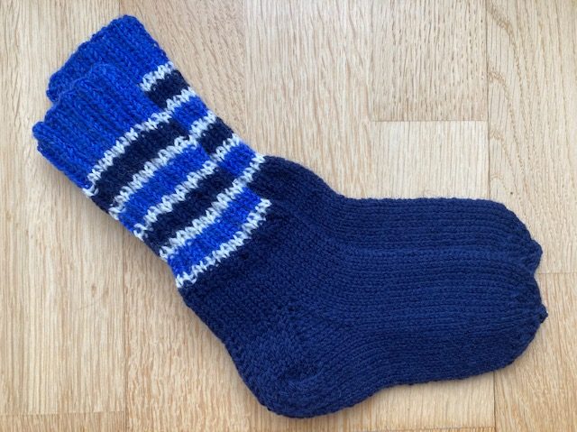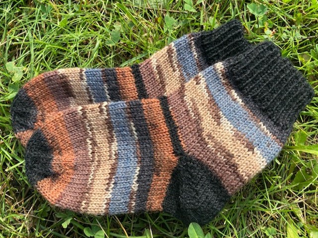 A pair of socks for a fast growing foot of a little boy. 2021. Socks are knitted from remains of the self-pattern yarn, which was remained after knitting a pair of adult socks.