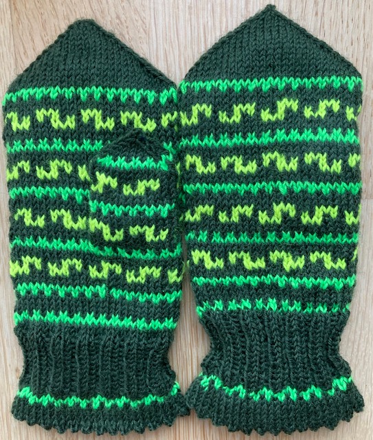 A set of hat and mittens, knitted on request of a 5-year old boy. Double-knitted mittens and hat. Outside – sock wool, inside – green merino wool. 2025.