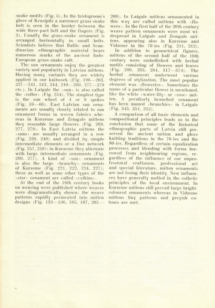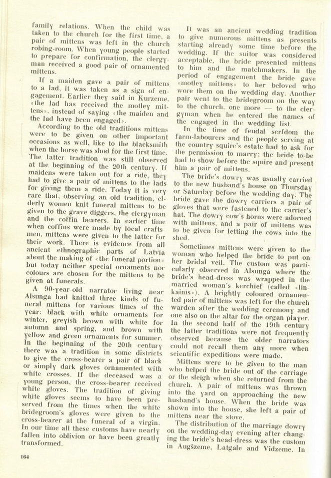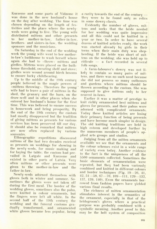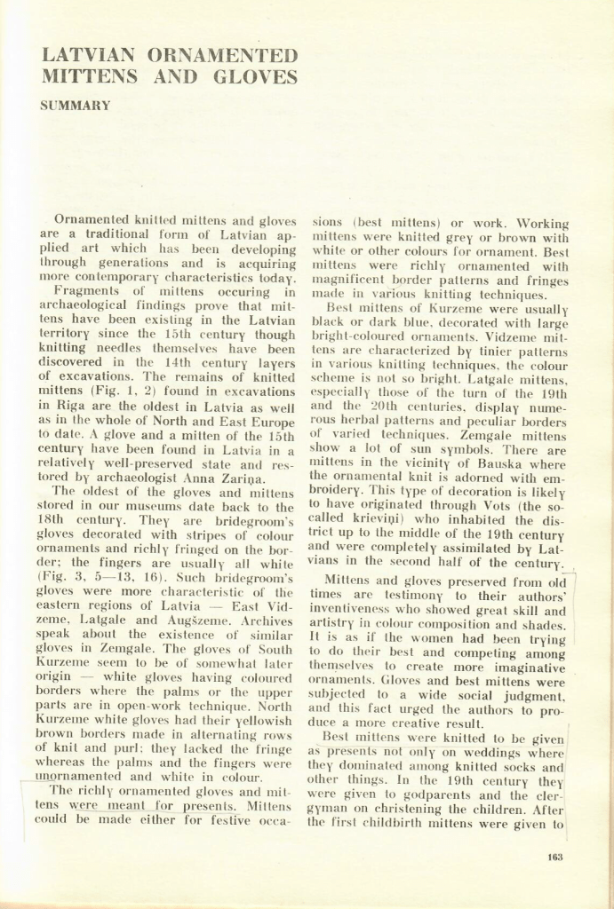 Here below you can find the scanned summary from the book of Mirdza Slava “Latvian Ornamented Mittens”. Slava, M., Latviešu rakstaine cimdi, Zinātne, Rīga, 1990.
