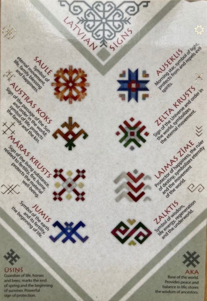 When I knit, I use a lot of Latvian elements and symbols. I do not need books to use them. I know them for so many years that I have forgot where is this information coming from. I have grown up with these signs, I live with them, and I believe in them. I do not know the names of these signs in English. Probably some linguists would argue, but I prefer keeping to the original name, and interpret its meaning. Here below are the basic examples of the signs and their meaning in Latvian ethnography.
