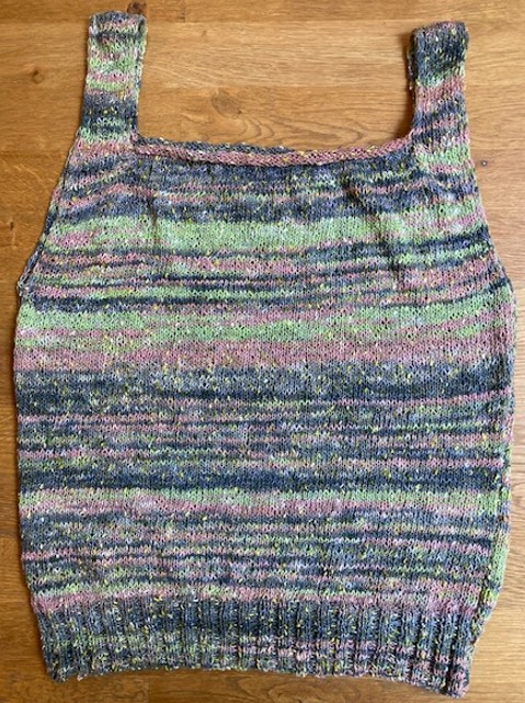 This top I knitted from a self patterned (mixing with stripes of single-colored) bamboo sock wool (200g). Knitted 2023.