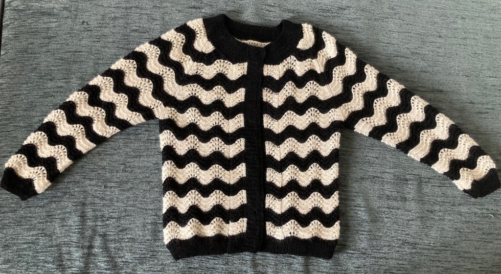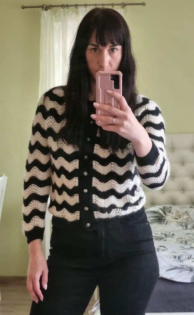 I knitted the stripy “wave” pattern cardigan on request. This cardigan was a big challenge, especially to conform the “waves” on the body and sleeves. White yarn – cotton+mohair, black yarn – cotton+silk+wool.Knitted 2023/2024.