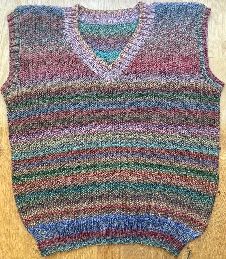 A vest for my husband – knitted as his birthday gift (2020). Dessert paintings wool.