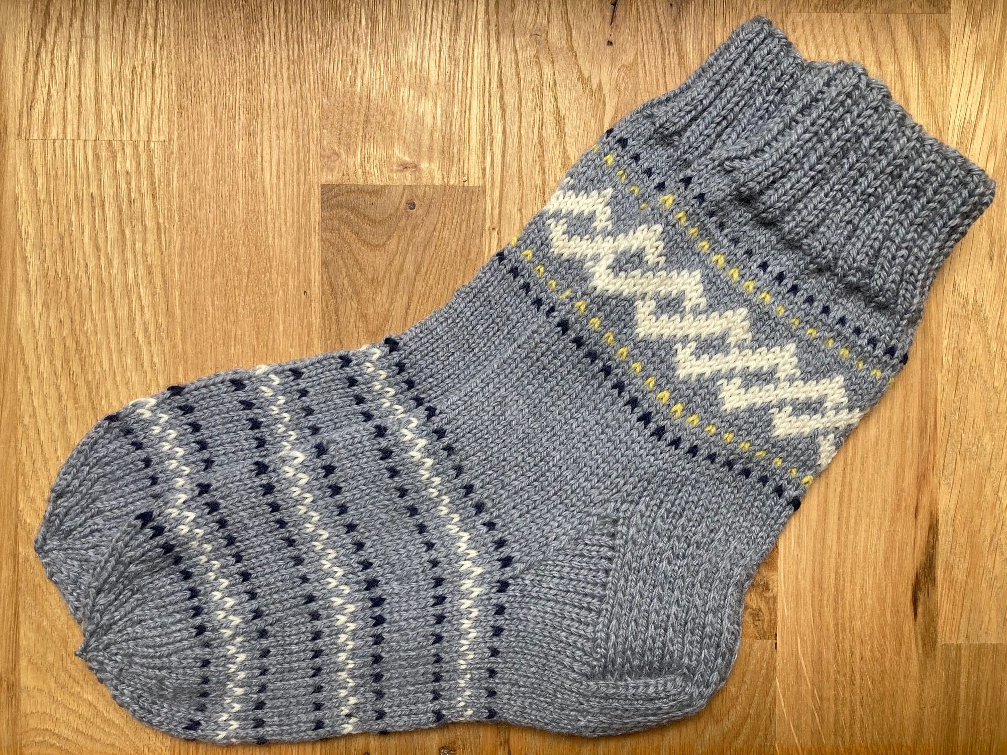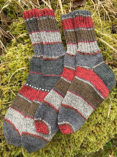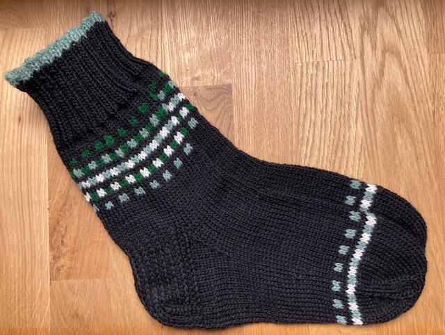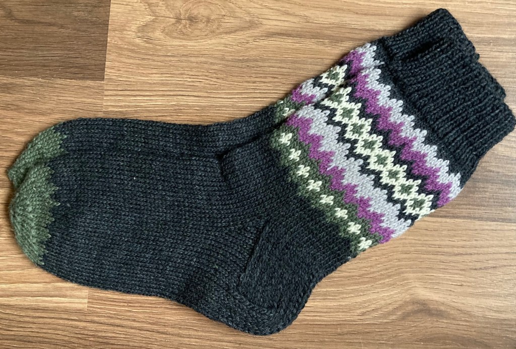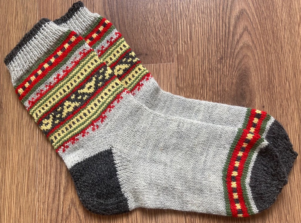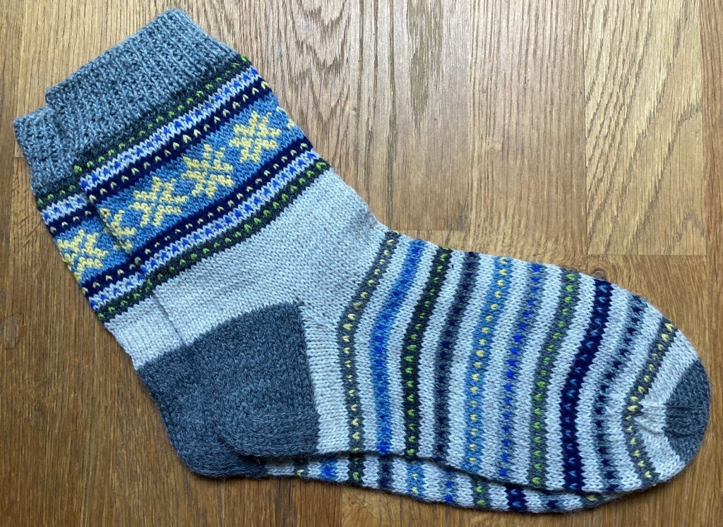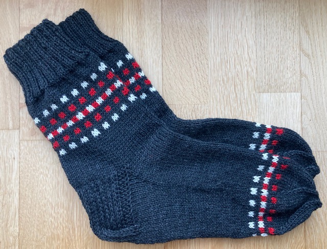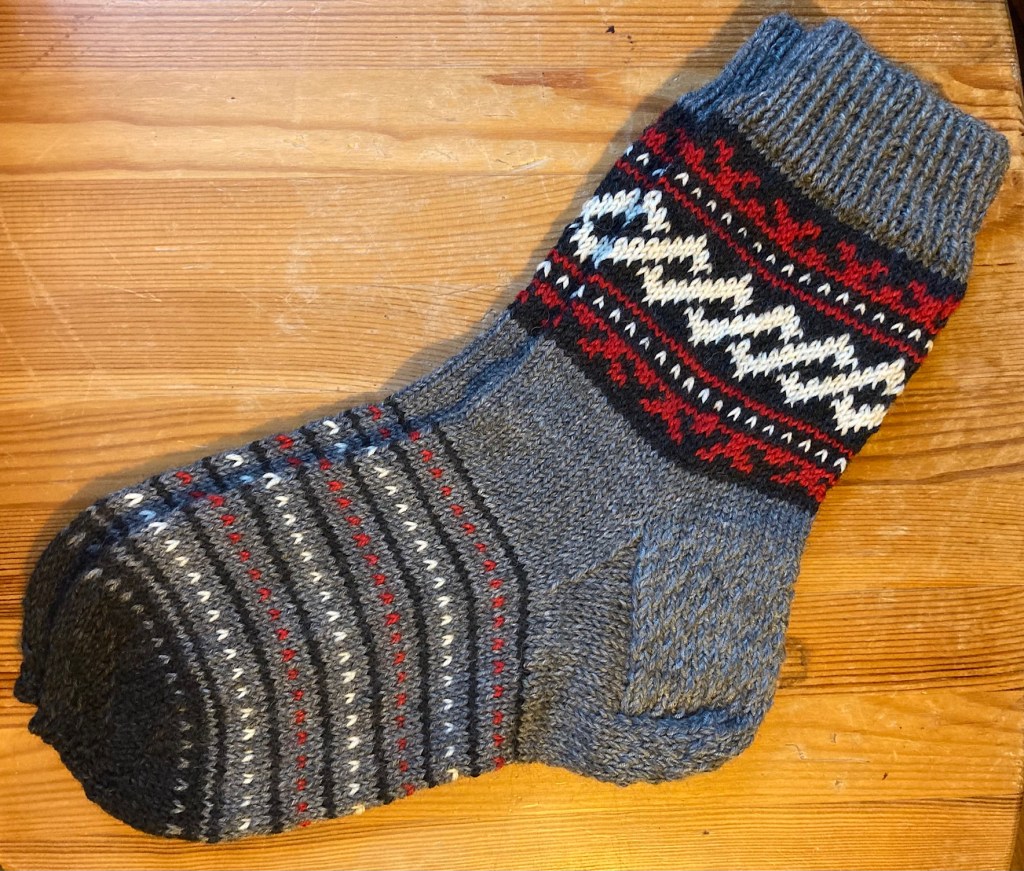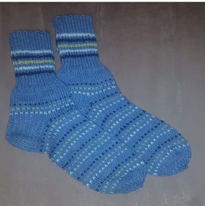 Socks knitted in December 2022, as a Christmas present. 6-ply woolen sock yarn used – the socks fill last long! The white ornament is chosen specially for the carrier – it is Janis sign.