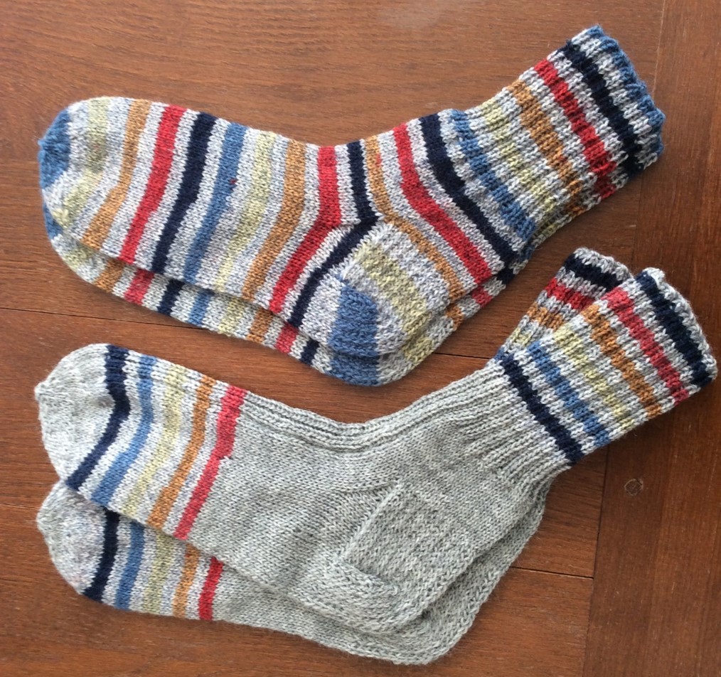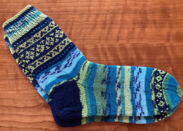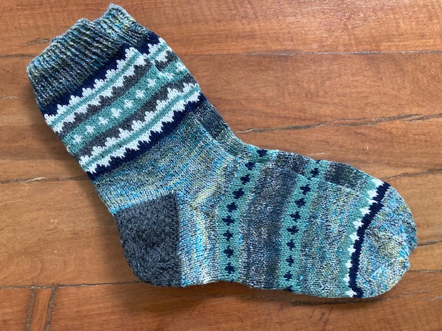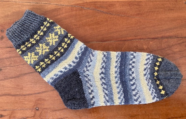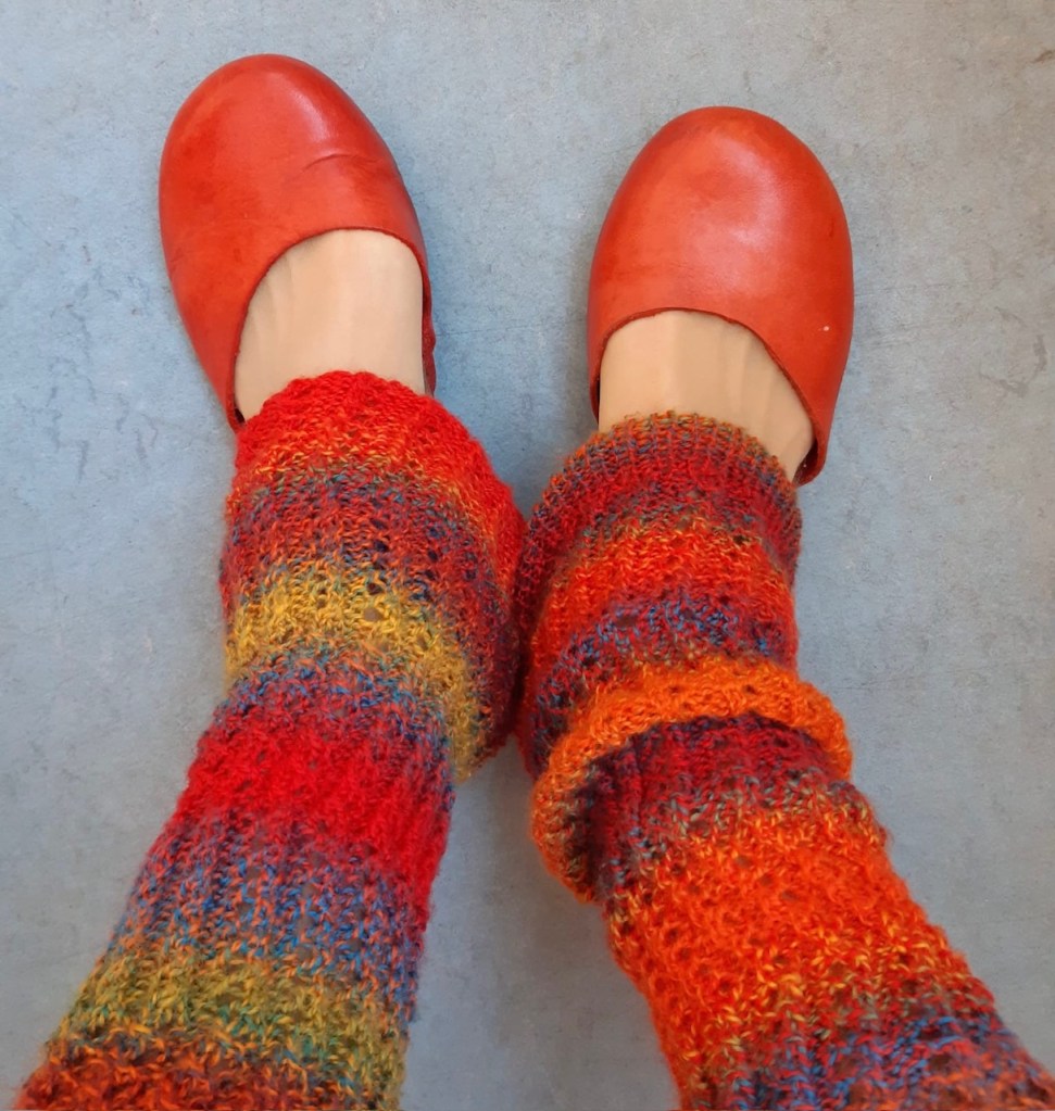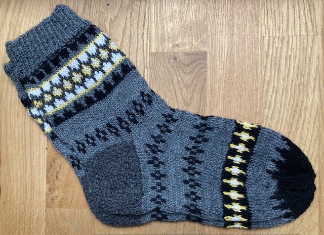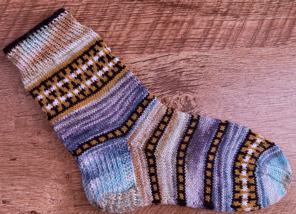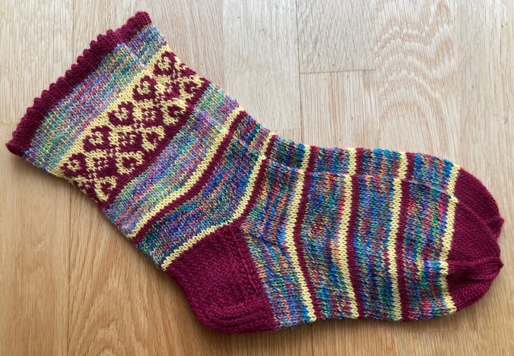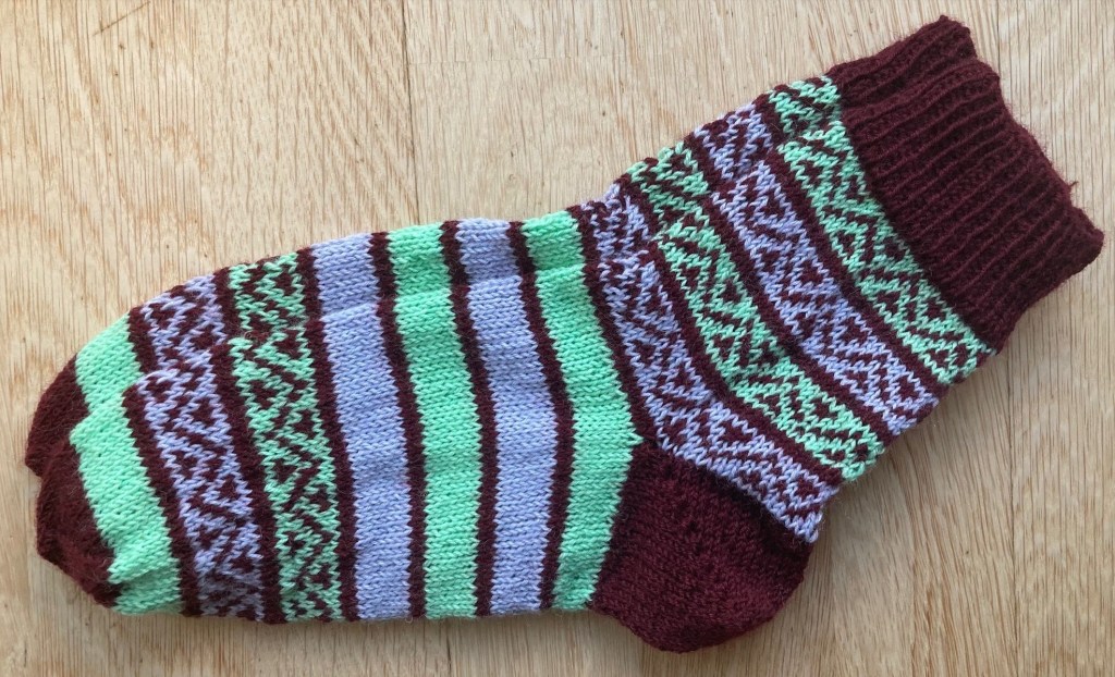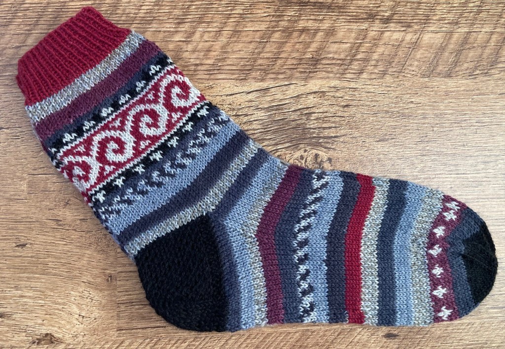 However, these socks were already inspired by Kerstin’s Balke “Colorful Knit Soxx – 26 Sock Patterns for Warm, Happy Feet” book – a new ornamental pattern was developed, and the new (for me) methods were tested: the Italian cast-on, the “boomerang heel” and the “anatomical” bind-off. 2021.