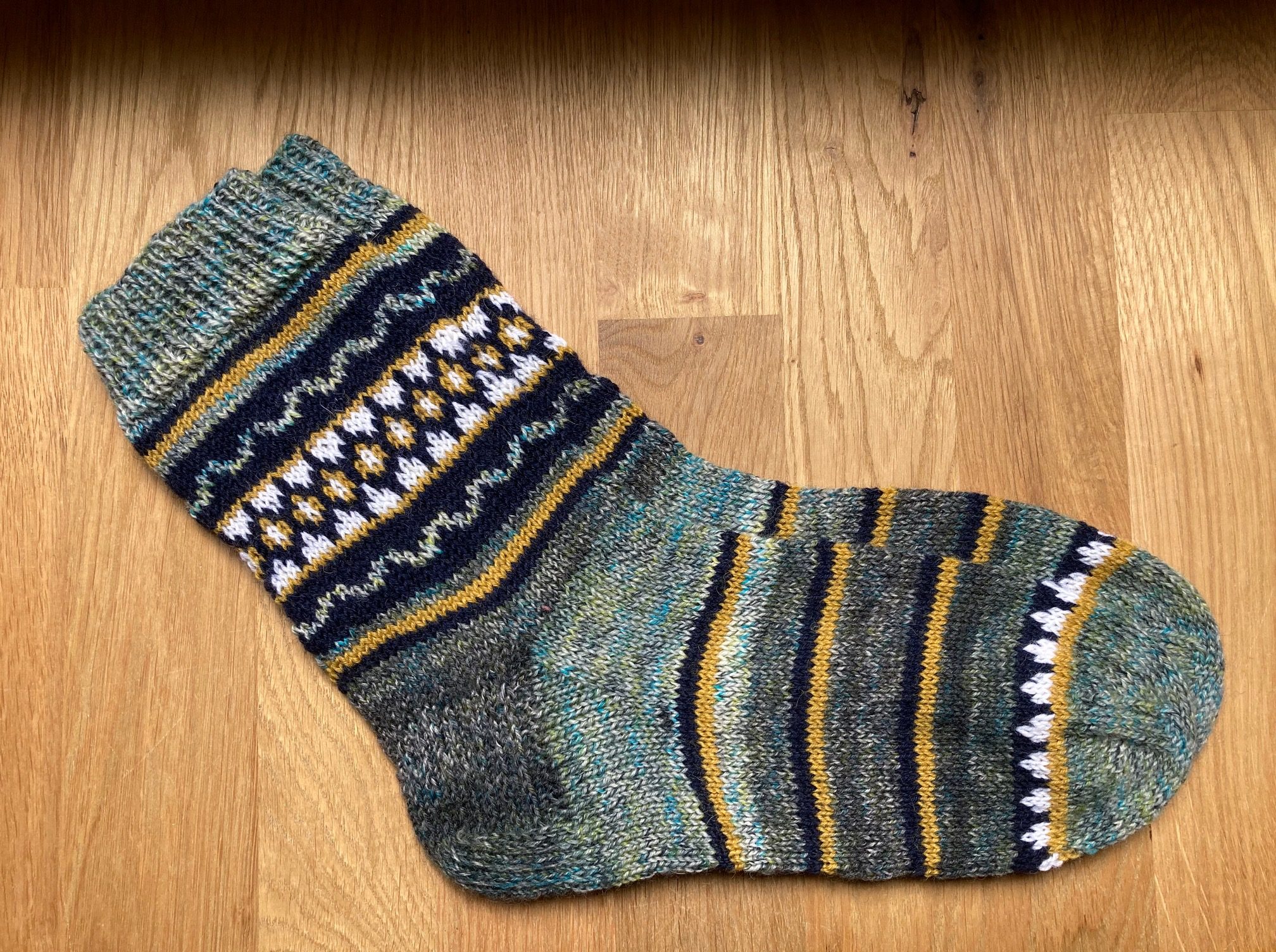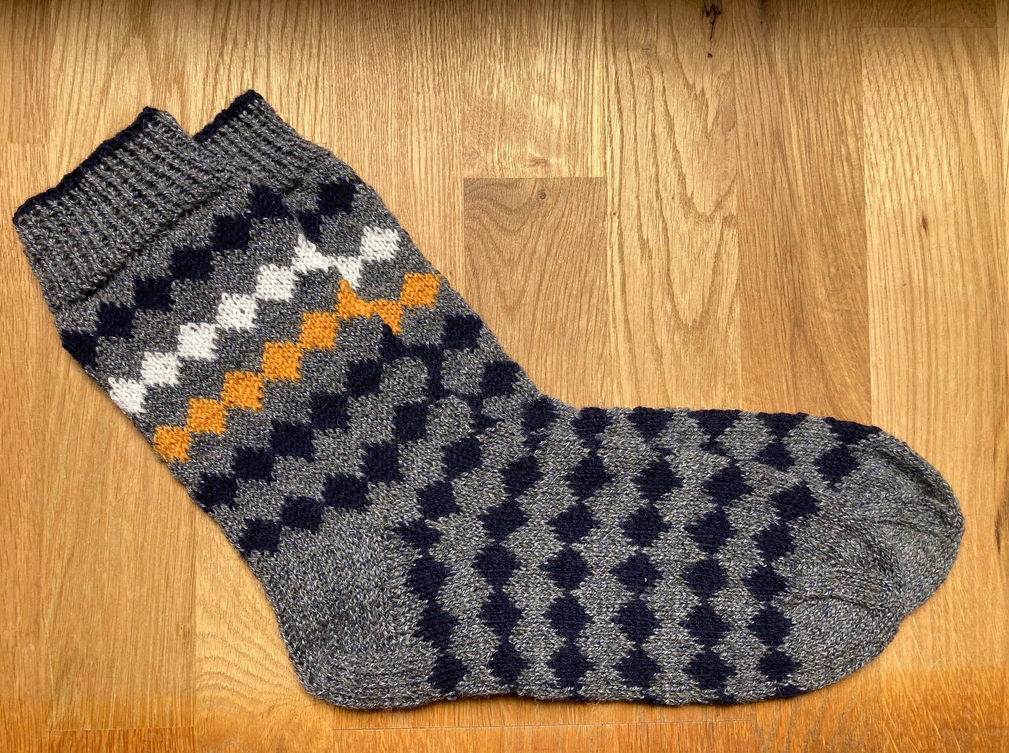 The modern sock yarns allow to knit beautiful ornamental socks from a single yarn (self-pattern), but sometimes I still prefer developing some unusual color patterns, that are individually matched to the person who will wear the socks.